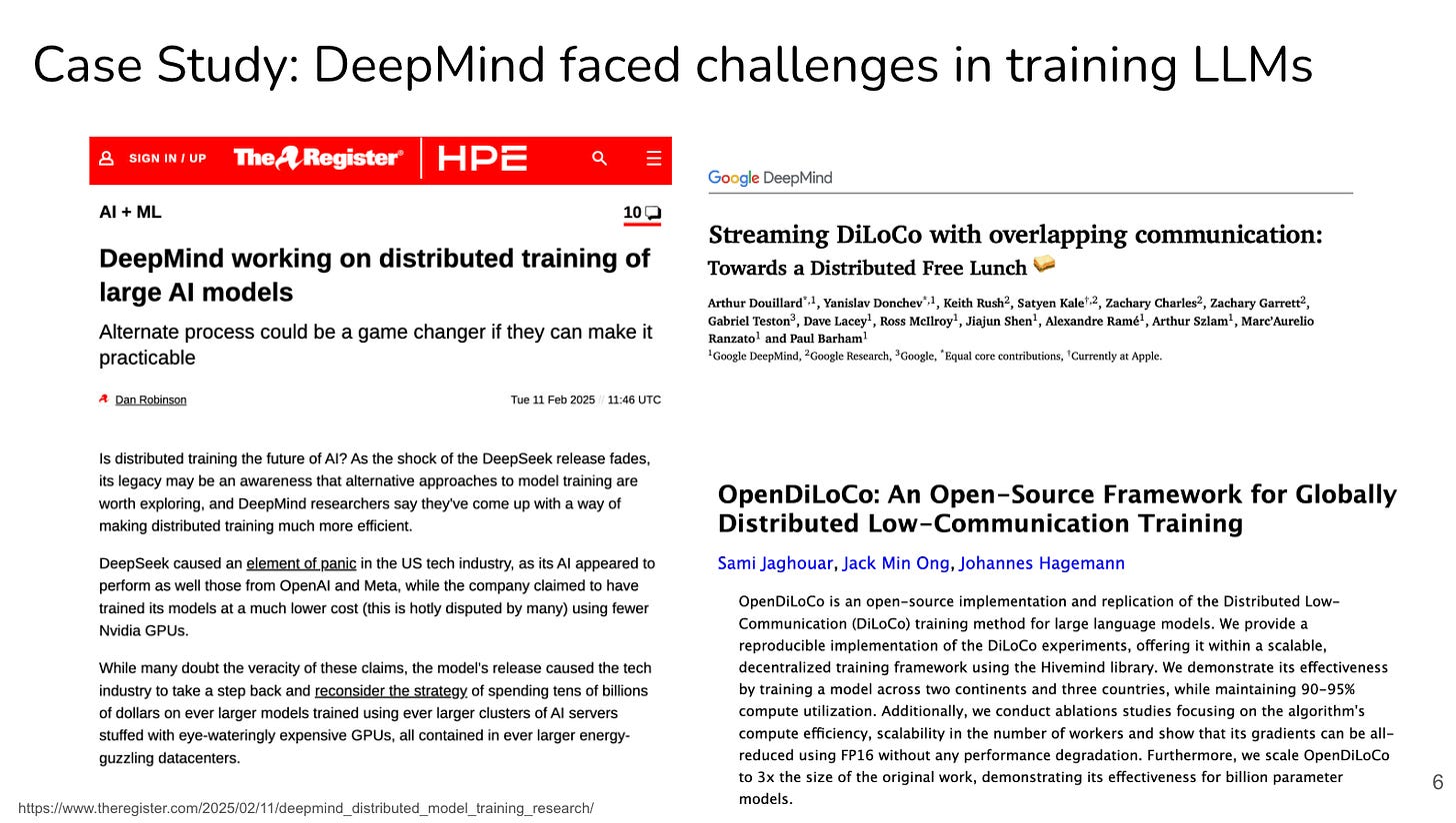 TLDR: DeepMind reported that even with thousands of GPUs, distributed training was stalling because a few slow nodes delayed global synchronization. In data-parallel training, the job waits for the slowest worker. Ray and Kubernetes help by managing elasticity (reassigning tasks when nodes fail) and scheduling (ensuring GPUs aren’t stranded in queues).